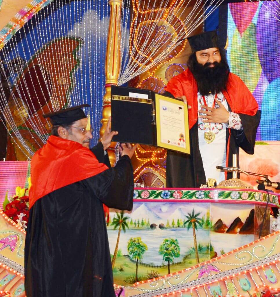 Nov. 8, 2016, 6 p.m.On the auspicious occasion of 25th January, Revered Saint Gurmeet Ram Rahim Singh Ji Insan was awarded with the degree of Doctorate by University of World Record London after being favourably influenced by versatility of Dera Sacha Sauda’s chief Saint Gurmeet Ram Rahim Singh Ji Insan. From now onwards Revered Saint Ji will be addressed as Saint Dr Gurmeet Ram Rahim Singh Ji Insan. Mr. Jai Krishan Sharma, Pro chancellor(India) of World Record University, London bestowed Doctorate degree to Revered Saint Ji along with a medal.